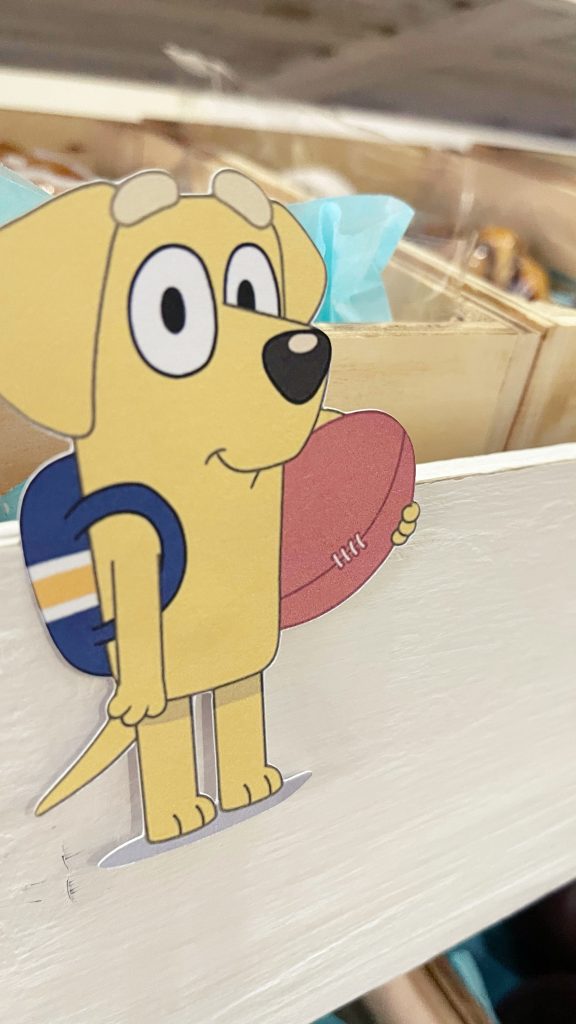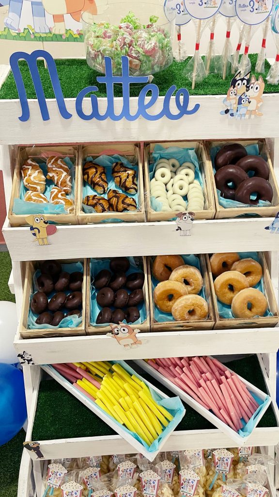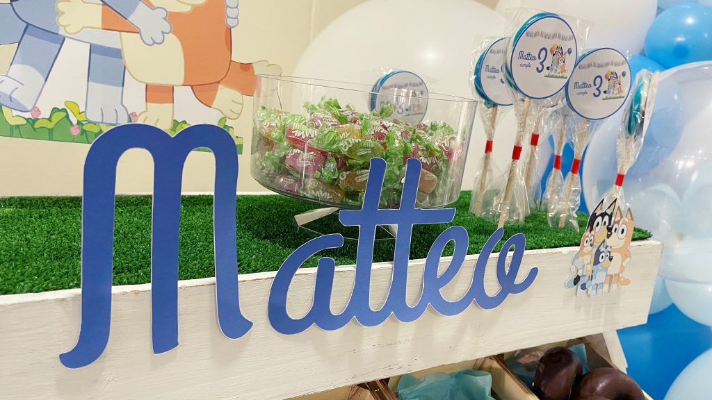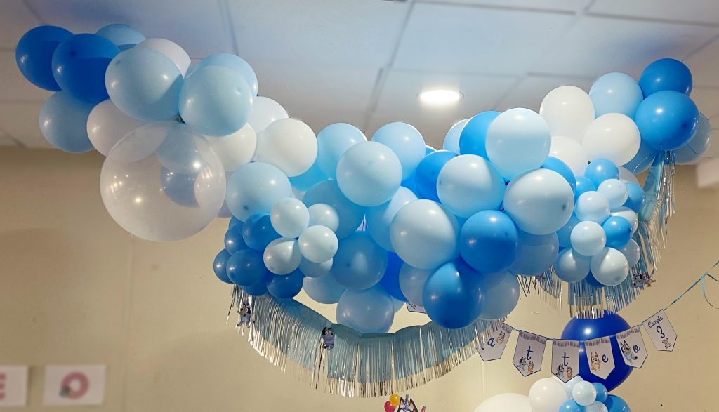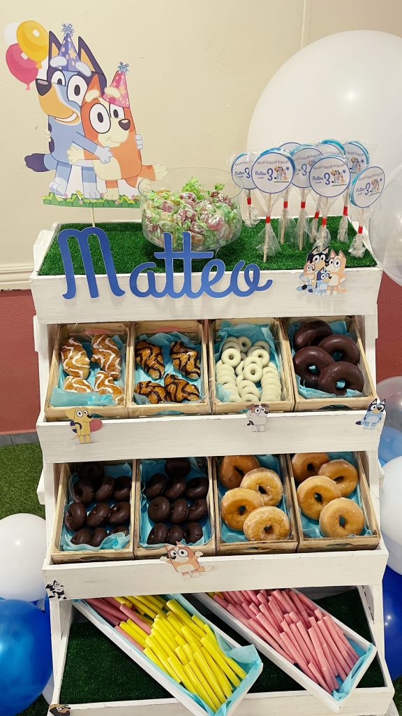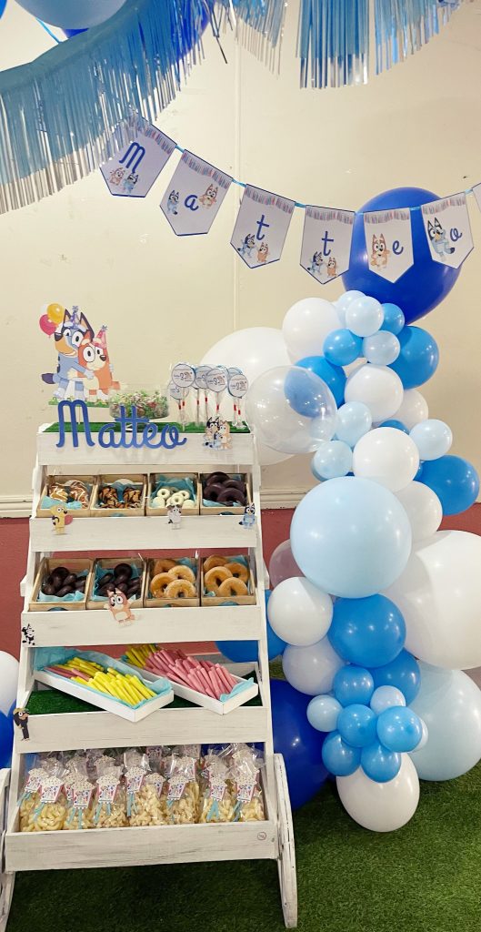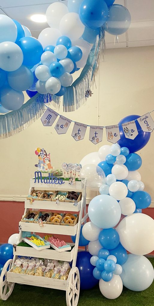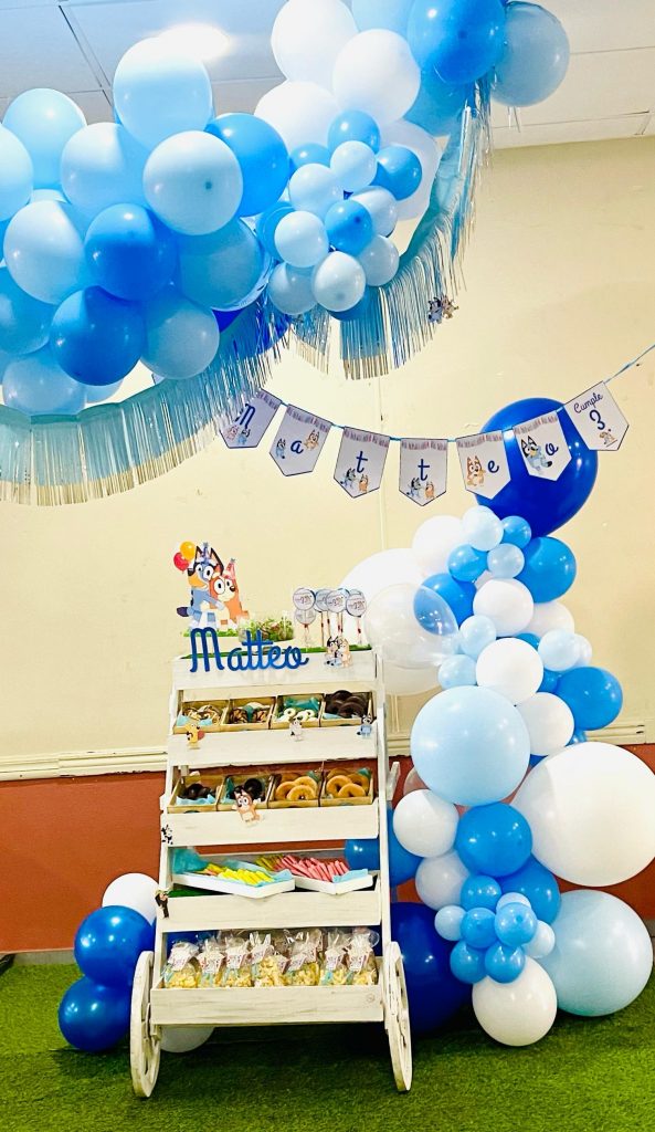 A sus 3 añitos disfruta muchísimo viendo los dibujos de Bluey y sus mamás quisieron que en este día tan especial estuviera presente su animación favorita. Guirnalda de globos en tonos azules y blancos, nuestro bonito carrito de cinco baldas y más globos para decorar, así quedó este rinconcito tan mono
